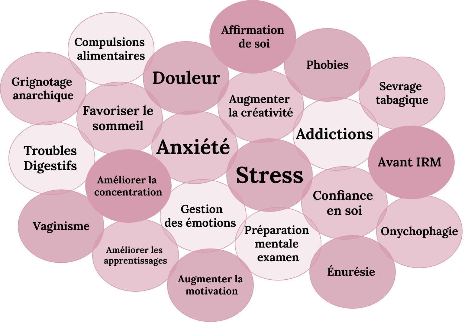 Le principe est de mobiliser les ressources internes pour accéder à un changement, comme par exemple, une meilleure gestion de la douleur, du stress ou des émotions au quotidien.
